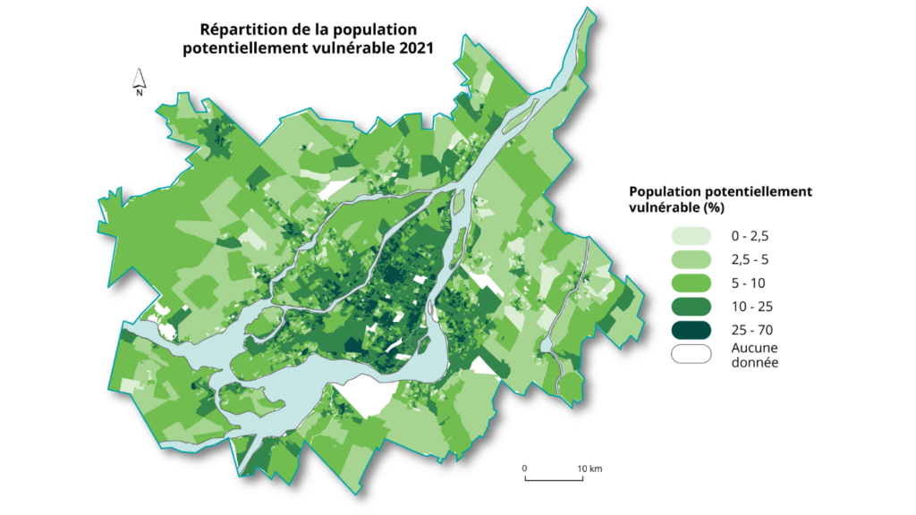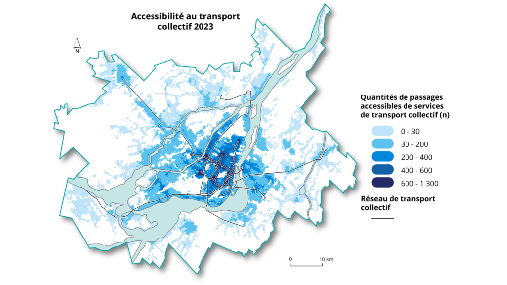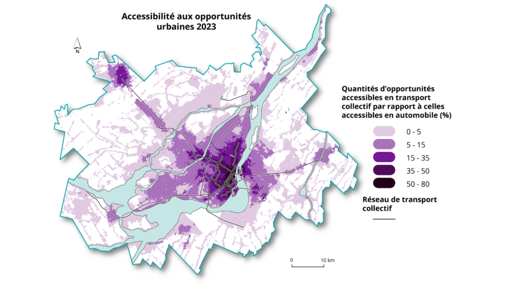 Même si l’offre de transport collectif y est globalement élevée, les analyses montrent que les niveaux d’accessibilité médians y sont de 12 % à 19 % plus faibles pour les populations vulnérables que pour le reste de la population.